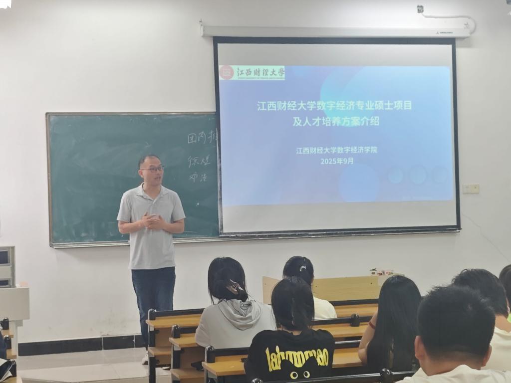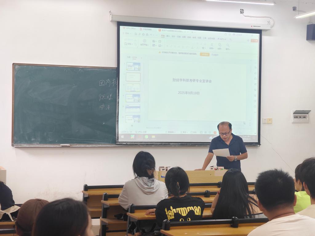 2025年9月19日上午10:10,财经楼116教室内气氛热烈,一场为财经学子量身打造的考研专业宣讲会在此拉开帷幕。本次宣讲会由江西财经大学陈肖华和陈剑两位老师受邀主讲,财经学科部党总支书记曹国华主持,财经学科部共计100余名学生参加了此次宣讲会。