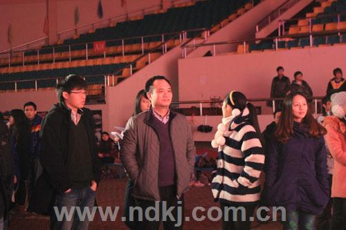2012年12月26日晚,学院“快乐2013年”迎新晚会最后一次联排在室内体育馆火热进行。院党委副书记廖梦园冒着大雨亲临晚会联排现场指导工作,他驻足台前,目光专注,看着演员们在台上妙趣横生的表演连连称赞,并与场内的演员和工作人员亲切交流,鼓励大家抓紧时间,精心排练,努力呈现一台精彩的晚会。