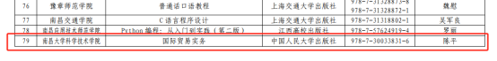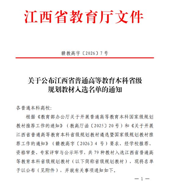 近日,根据江西省教育厅下发的《关于公布江西省普通高等教育本科省级规划教材入选名单的通知》(赣教高字[2026]7号),学院财经学科部陈平教授主编的《国际贸易实务(第五版)》成功入选。该教材是本次遴选独立学院中唯一获批的省级规划教材,实现了学院省级规划教材零的突破,标志着学院在深化教育教学改革、推进教材精品化建设方面取得标志性成果。
