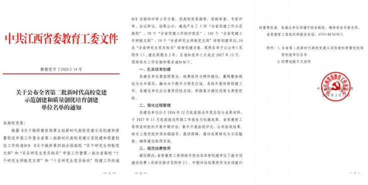 近日,中共江西省委教育工委公布了全省第二批新时代高校党建示范创建和质量创优培育创建单位名单,遴选产生“全省党建工作标杆院系”50个和“全省党建工作样板支部”102个。我学科部党总支成功入选“全省党建工作标杆院系”培育创建单位,是全省独立学院中唯一获此殊荣的基层党组织。