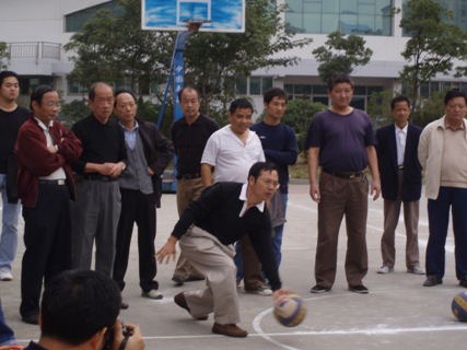 来自各学科部和两个机关队的22位老师兴致勃勃地参加了教工男子老年组趣味保龄球比赛。在三分线上,参赛老师们将手中的排球扔出的同时,眼睛密切关注着呈倒三角形排列的矿泉水瓶倒地的数量,脸上的表情随着裁判的裁决而变换着。