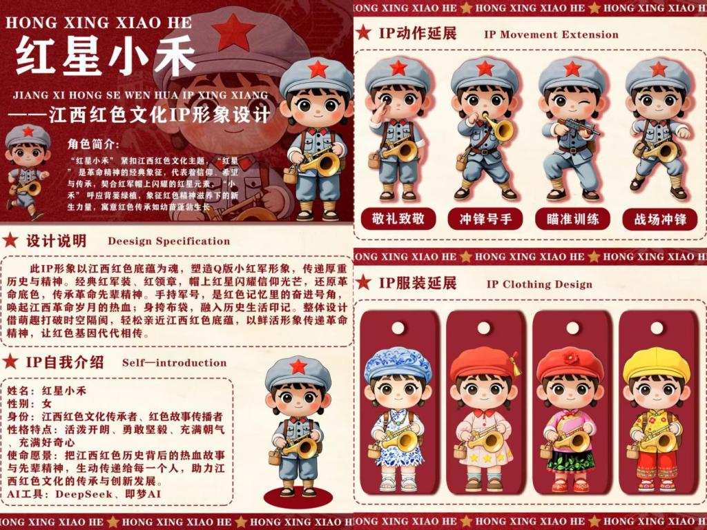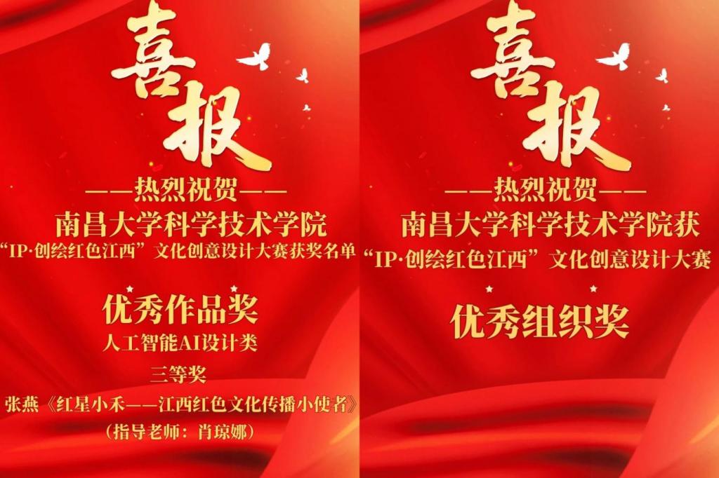 近日,“IP·创绘红色江西”文化创意设计大赛获奖名单正式公布,我院荣获“优秀组织奖”。同时,由肖琼娜老师指导、张燕同学创作的《红星小禾——江西红色文化传播小使者》作品,在人工智能AI设计类比赛中脱颖而出,荣获三等奖。