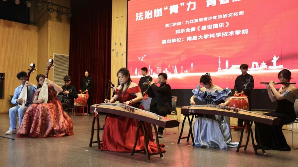 在九江市首届青少年法治文化节上,南昌大学科学技术学院华韵民乐团带来的民乐合奏《盛世国乐》奏响法治与时代共鸣的序曲,赢得现场阵阵掌声。
