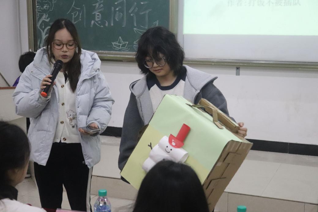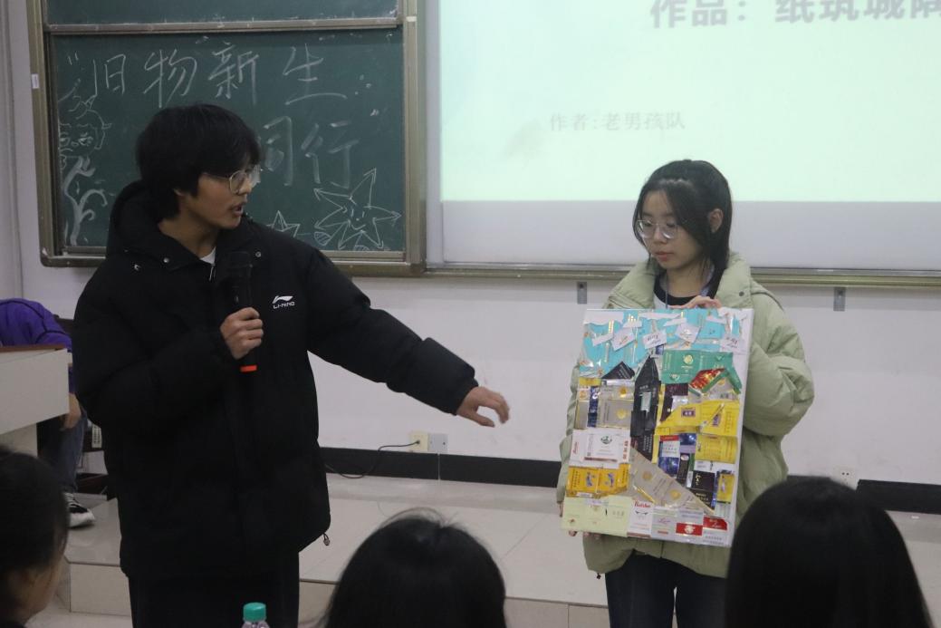 参赛选手紧扣赛事主题,巧思频现:奶酪队以废餐盘、外卖袋、闲置蜡烛为原料,打造出了创意蛋糕造型作品;蓝海映宣队巧用宣纸、纱布等旧物,设计出带有收腰设计的时尚服饰,凸显环保理念;老男孩队从色彩课获得灵感,收集各类烟盒、纸盒,搭配双面胶和剪刀,搭建出包含房屋、道路、天空、白云的立体场景,既宣传戒烟理念又践行环保;打饭不被插队利用快递盒,辅以彩纸胶带,制作出拉杆可伸缩、轮子能转动的储物行李箱,解决宿舍收纳难题;极利队聚焦宿舍空间利用痛点,用快递盒、一次性筷子、吸管等打造分层式收纳盒,适配宿舍柜子高度,方便分类存放小饰品等;法式小面包队则将外卖包装袋裁剪改造,搭配固体胶、订书钉等,制成可挂在寝室挂钩上的零食袋,兼具实用性与可爱造型。