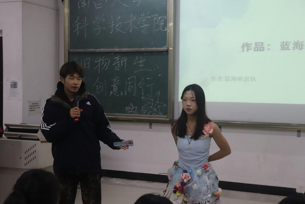 比赛以“旧物新生,创意同行”为主题,聚焦校园旧物资源循环利用与创意实践。比赛现场,七支队伍的参赛选手依次登场,简洁地讲述了作品的灵感来源、材料选用、搭配巧思及制作过程。选手们以外卖袋、废纸壳等为核心创作材料,将旧物改造为时尚服饰、创意工艺品等作品,展现出丰富的想象力与动手能力。