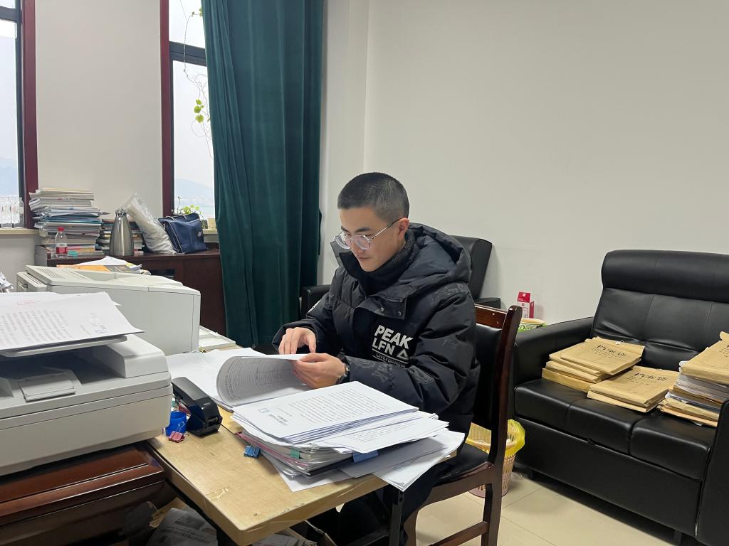 (图为谈治廷整理案件卷宗并归档)