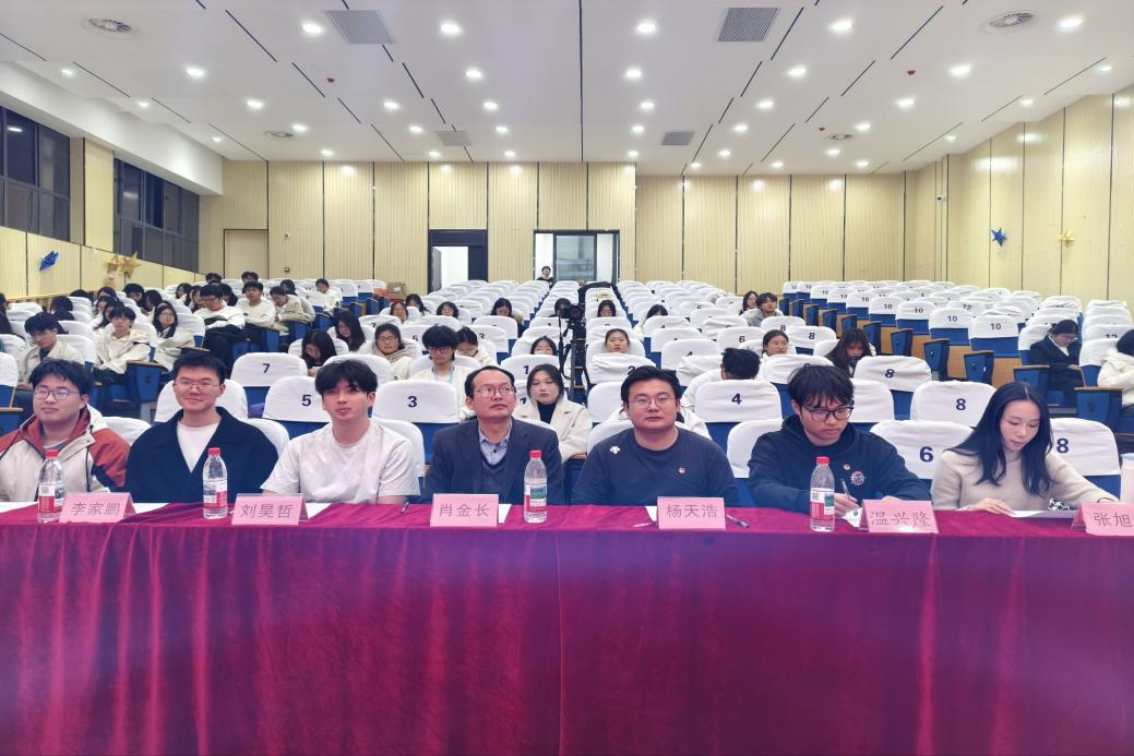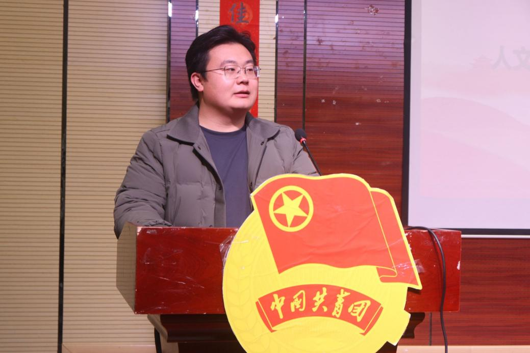 大会伊始,主持人致开场词,对参会的嘉宾和各位团总支成员表示热烈的欢迎。接着,杨天浩向党总支作本学期工作汇报,他提到:在本学年中,团总支首先要紧抓思想建设,扎实开展“青马工程”培训与主题团日等活动;其次,团总支深耕华服节等人文特色主题活动,在各类赛事中屡获佳绩,同时还在暑期三下乡等活动中成果丰硕;最后,他号召大家应将个人理想融入时代发展,勇担青春使命、书写奋斗年华。