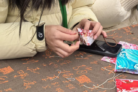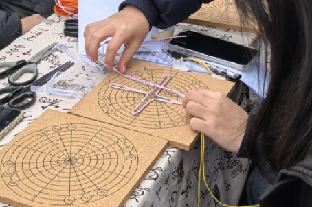 活动现场设置了答题领奖品与体验区参与两大核心环节,答题正确率达标的参与者可领取流苏、串珠等精美小礼品;持有华服节游戏通关章的同学,还能直接兑换对应奖品。体验区划分绳结编织、缝制香囊、漆扇制作、糖画四大板块,各板块均配备工作人员进行指导,并为参与者预留充足的创意创作空间。