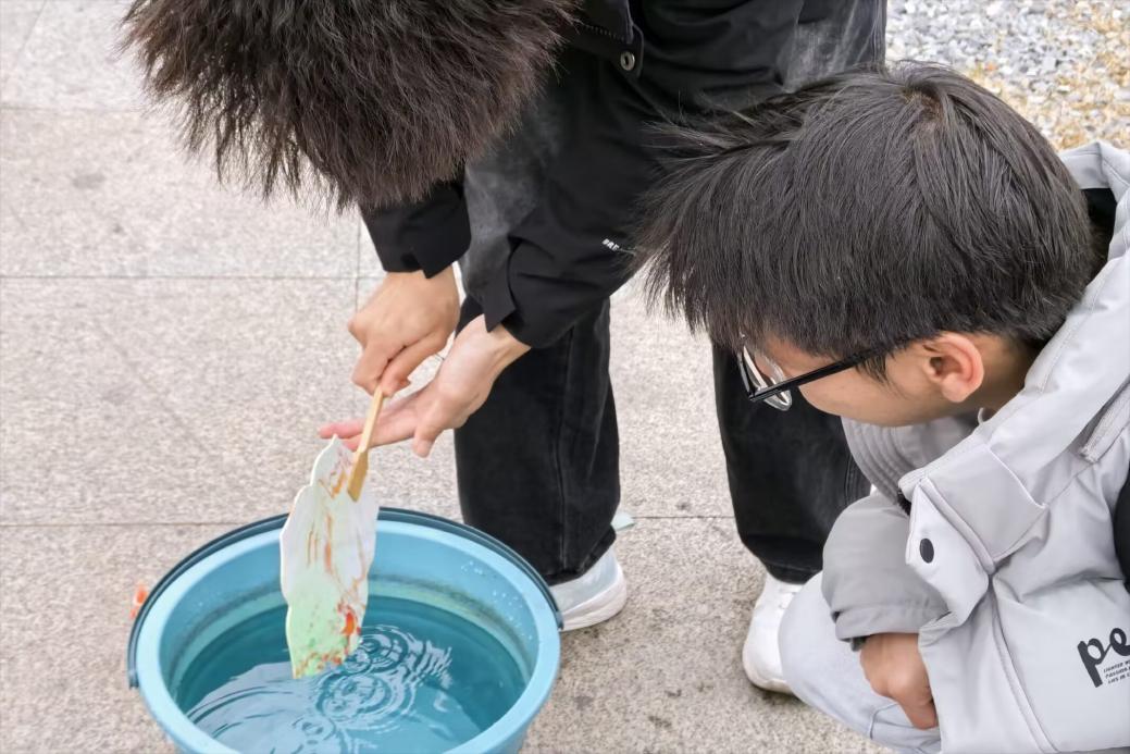 绳结编织体验区中,参与者在视频教程或工作人员指导下,学习平结、吉祥结等基础技法,用彩绳创作手链、挂饰等作品;缝制香囊体验区支持个人创作和2-4人小组协作两种模式,个人可制作简约款香囊,小组则能分工完成裁剪、缝纫、填充、装饰等环节并发挥创意搭配纹样;漆扇制作体验区里,参与者跟随指导用吸漆纸清理杂色漆渍,将漆颜料滴入水中形成自然纹理后完成扇面图案转印;糖画体验区中,参与者选定图案后,在加热器辅助下用熔化的糖棒绘制糖画,待糖浆冷却定型后即可取走成品。每个体验区均遵循“一人限玩一次”的规则,让参与者有序参与,感受不同非遗技艺的创作乐趣。