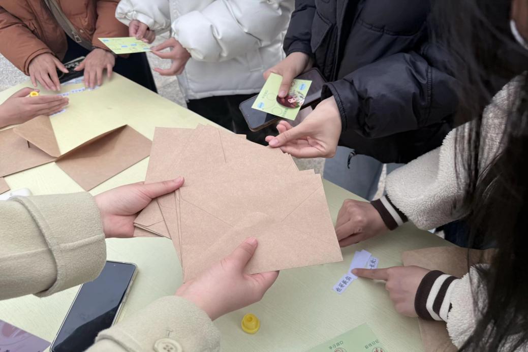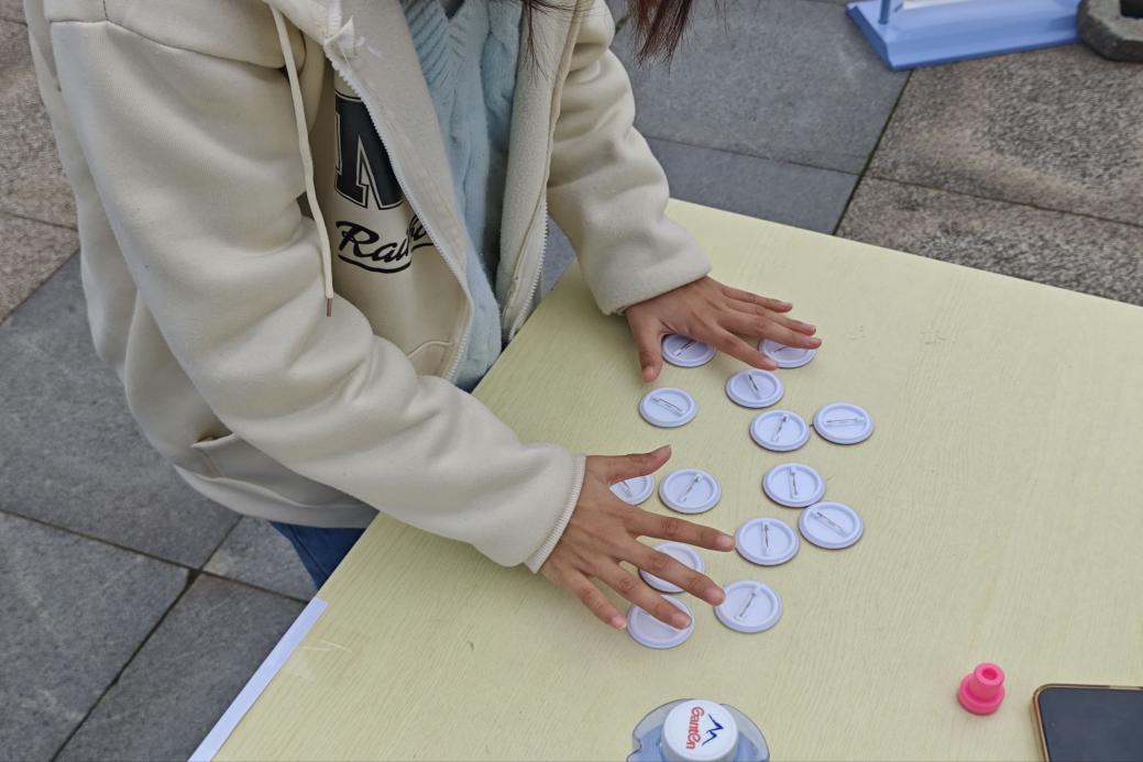 “春日暖签”环节洋溢着蓬勃活力,同学们转动转盘,随机抽取趣味任务——或是以亲切的家乡话朗读《雷锋日记》中的经典段落,或是向路过的陌生人真诚道出一声夸赞,抑或是在人群中即兴宣讲雷锋精神……一个个创意举动,让温暖在行动中流淌,也让担当在践行中悄然扎根。“薪锋记忆”则以徽章翻牌游戏为载体,在趣味挑战中考验记忆力。一翻一揭之间,雷锋的生平事迹与精神内涵悄然印入心间,让了解英雄的过程既充满乐趣,也愈加深刻。