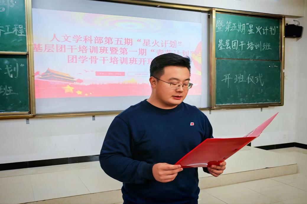 11月5日下午,人文学科部于明德楼130教室举行青年马克思主义者培养工程暨第五期“星火计划”基层团干培训班暨第一期“青苗计划”团学骨干培训班开班仪式。出席本次活动的嘉宾有:人文学科部党总支副书记肖金长、团总支指导老师杨天浩。吴怡、谈治廷担任主持。