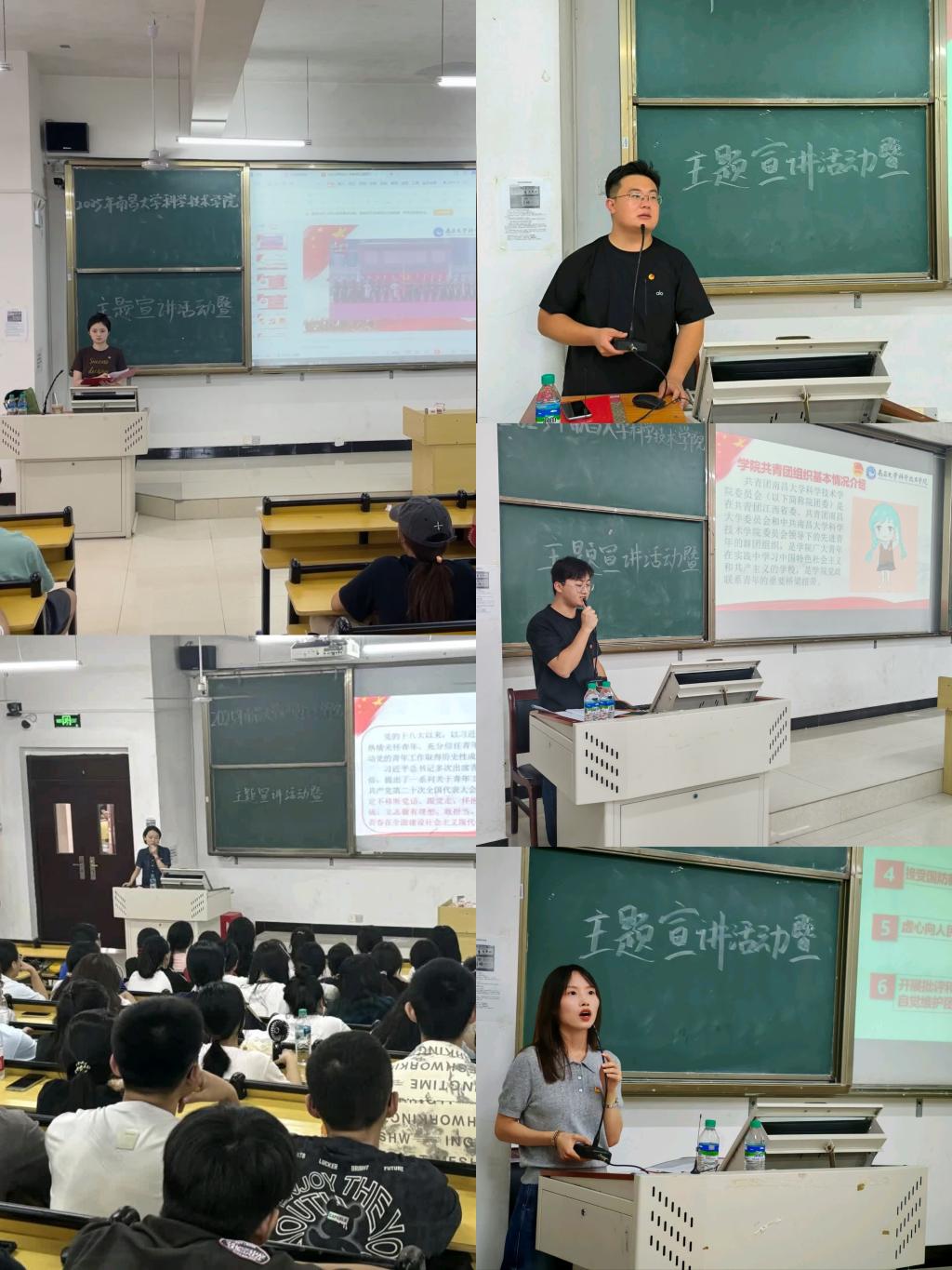 主讲人紧扣“践行团员使命,传承五四荣光”与“发扬科院精神,争做时代新人”两大篇章展开讲述。以中国共青团基本知识为切入点,深入阐释中国共青团的历史进程,帮助新生清晰、深刻的认识团组织,同时,主讲人向新生介绍了”三会两制一课”基本制度、“第二课堂”制度以及校园文化建设等内容。最后,暑期社会实践代表们也纷纷登台,分享在乡村振兴、社区服务等实践活动中的亲身经历,为新生带来了一堂生动的社会实践“第一课”,也为他们今后参与实践提供了宝贵借鉴。