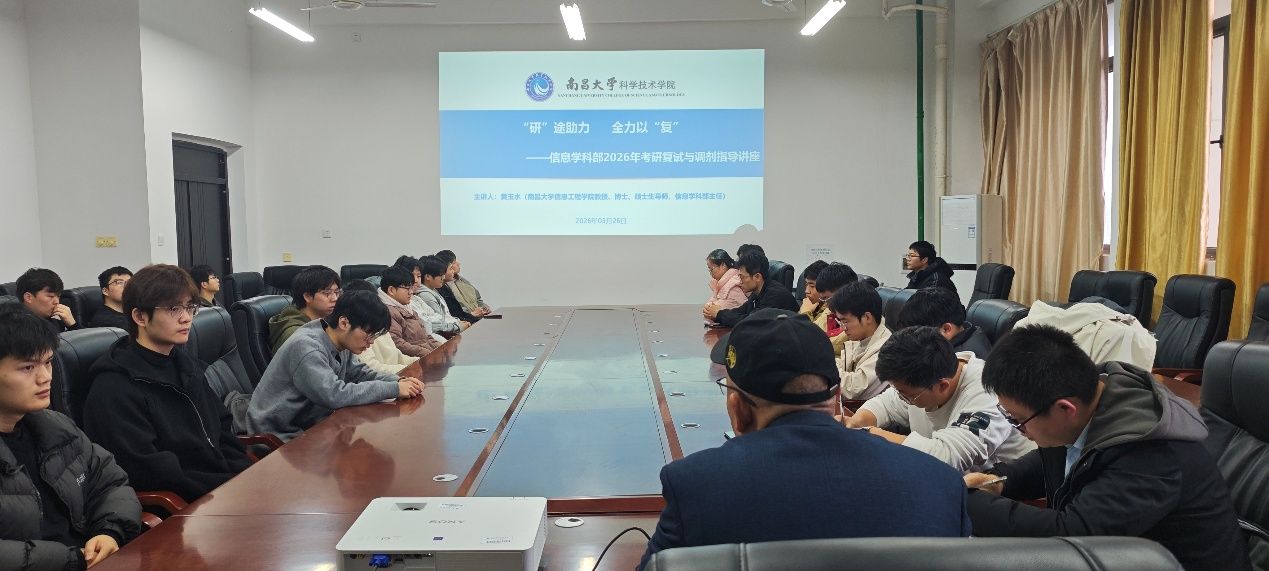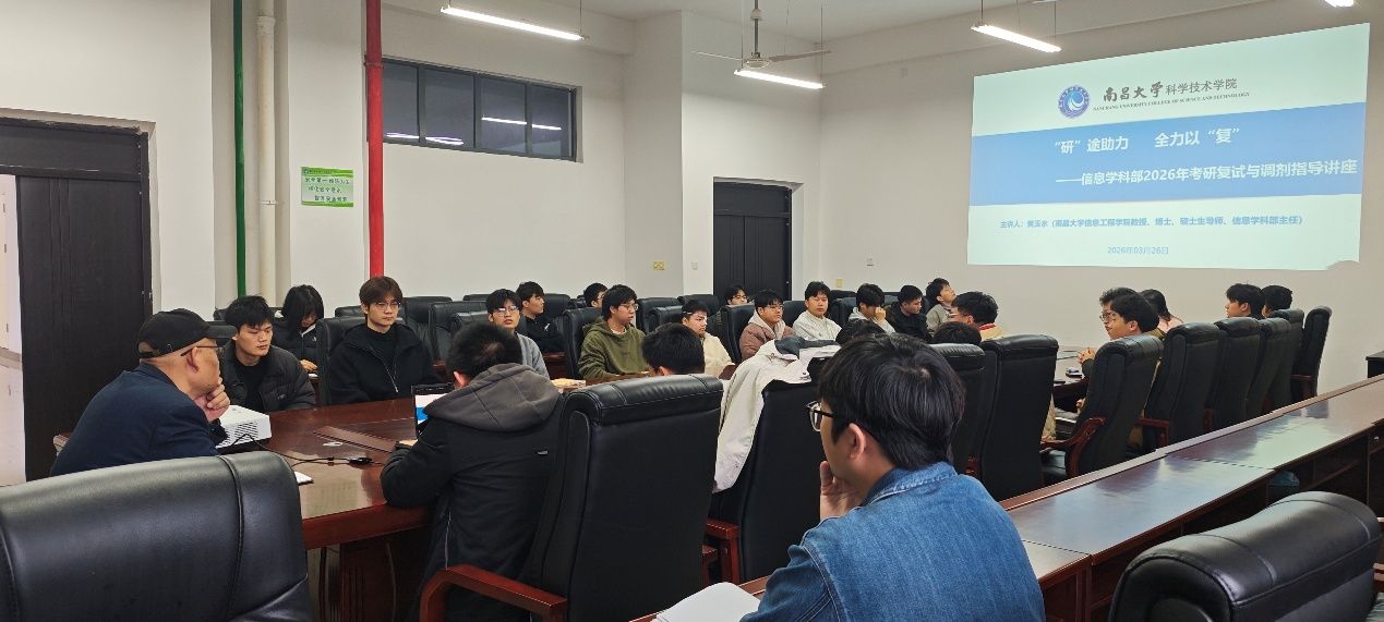 为帮助信息学科部考研复试学子更好地熟悉了解2026 年考研复试与调剂政策和流程,精准把握复试备考方向、复试方法和技巧,科学规划调剂,缓解备考压力和焦虑,3月26日上午,信息学科部举办了主题为“‘研’途助力,全力以‘复’”的2026年考研复试与调剂指导讲座,特邀学科部主任黄玉水教授担任主讲嘉宾,学科部党总支副书记饶超影、学科部副主任何尚平、部分毕业班辅导员及2022级考研上线同学、部分23级准备考研同学参加了此次讲座,本次讲座由何尚平主持。