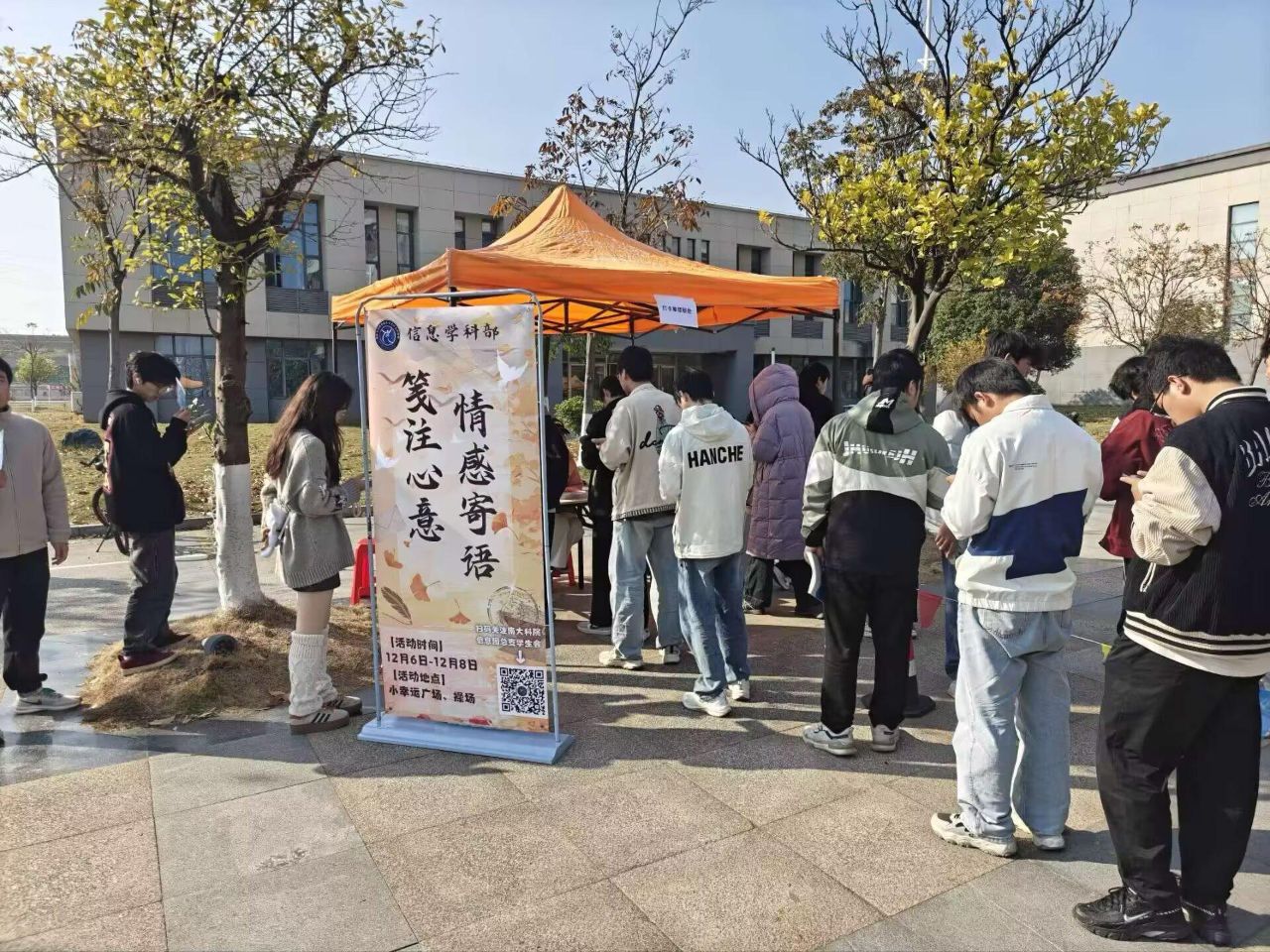 为进一步丰富校园文化生活,营造温馨和谐的校园氛围,同时为同学们搭建起情感倾诉与交流的专属平台,让大家能在快节奏的校园生活中找到情感表达的窗口。南昌大学科学技术学院信息学科部于12月6日至12月9日在小幸运广场与操场举办第一届“笺注心意,情感寄语”校园文化活动。 活动现场热闹非凡,同学们踊跃参加各项趣味游戏,在欢声笑语中收获了满满的乐趣。每完成一项游戏,参与者便可在打卡单上加盖一枚印章,活动以印章数量作为兑换依据,为同学们准备了五类各具特色的精美信封。同学们怀揣着满腔热忱,有序地排起长队,将写满心意的信件交给工作人员。另一边,其他工作人员们分工明确、有条不紊。往来的身影交织成一幅热闹的画卷,每一个忙碌的瞬间,都在为这份校园里的温情传递保驾护航。