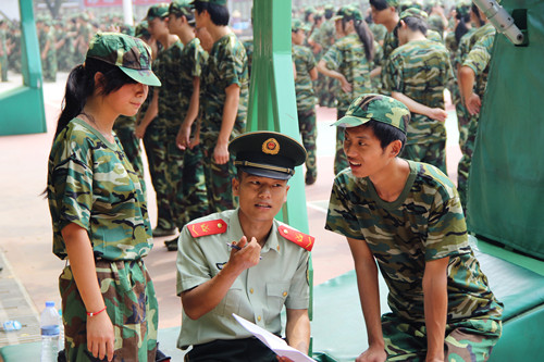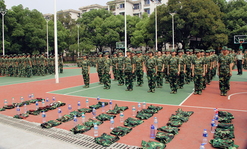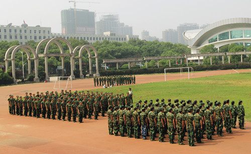 9月11日上午,身着绿色迷彩服的2012级新生们按时来到军训指定点,开始了为期13天的军训生活。今天是军训的第一天,烈日骄阳考验着新生们的毅力。