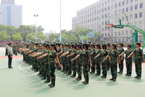 军训开始前教官们都进行自我介绍,并对新生们在出勤、请假、遵守纪律等方面作出了严格要求。今天新生军训的主要内容是定军姿和走正步。教官以军人的标准严格要求,力求使参训学生每个动作都做到规范、准确、到位。“头抬起,手放好,中指紧贴裤缝线,”教官大声喊着。新生们听从教官的命令,热情饱满地投入其中,认真地完成训练项目。