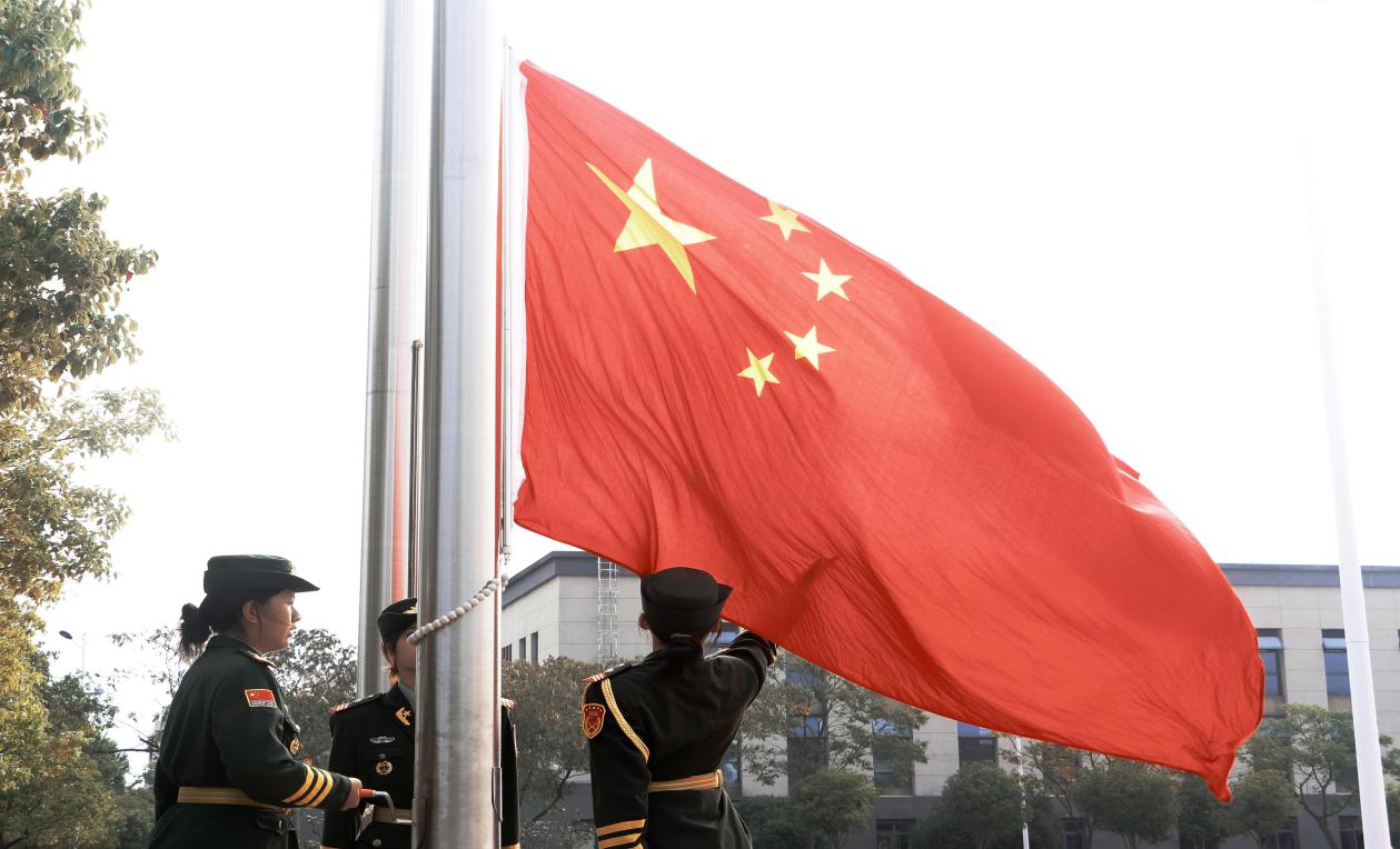 映照着晨光,雄壮的《义勇军进行曲》奏响,鲜艳的五星红旗冉冉升起,全体人员肃立行注目礼,赤诚的爱国情怀在田径场上空激荡。