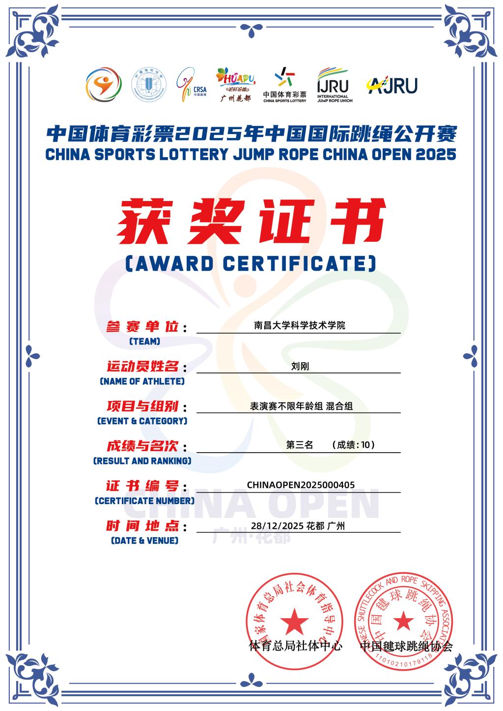 2025年12月28日,中国体育彩票2025年中国国际跳绳公开赛暨全国跳绳联赛总决赛“CHINA SPORTS LOTTERY JUMP ROPE CHINA OPEN 2025 & NATIONAL LEAGUE FINALS”于在广州花都东风体育馆顺利闭幕,我院代表队在陈欢、王翔、刘刚、林娜等老师带领下,喜获世界公开赛第三名和全国总决赛交互绳速度赛第一名。同时,刘刚作为教练兼队员参赛,获得了世界公开赛第三名和第七名的好成绩,师生成绩均取得历史性突破。