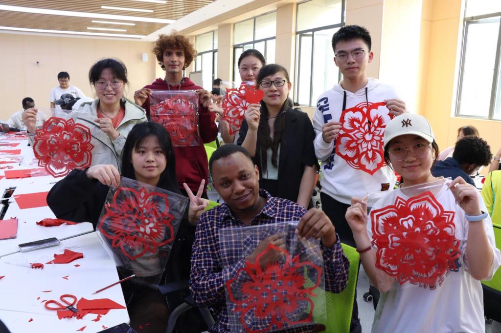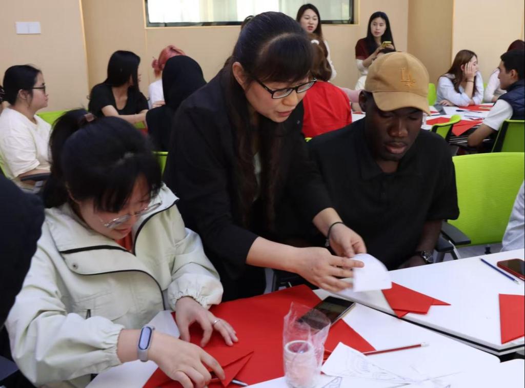 剪纸现场,学院学生主动分享剪纸民俗故事,搭建文化沟通桥梁,来华留学生在实操中体悟东方美学韵味,触摸中华文化底蕴,一折一剪,指尖翻转间,一张普通的红纸在师生们的手中渐渐蜕变为寓意吉祥的窗花、灵动雅致的纹样,尽显非遗魅力与文化温情。